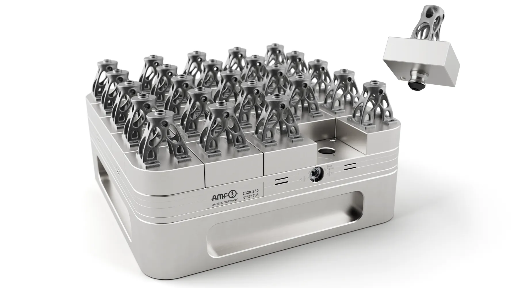 Das AMF-Substratplattenspannsystem basiert auf der industriell bewährten Nullpunktspanntechnik, die seit Jahrzehnten in Luftfahrt, Maschinenbau und Automotive höchste Präzision garantiert. Für die additive Fertigung wurde diese Technologie speziell weiterentwickelt, um eine positionsgenaue, schraubenlose Fixierung und eine flexible, segmentierte Spannfläche zu ermöglichen. Die Basisplatte besteht aus hochwertigem Edelstahl und ist bis 300 °C temperaturstabil – ideal für Titan, Aluminium und andere wärmebelastete Werkstoffe. Dank standardisierter Schnittstellen ist das System retrofit-fähig und mit nahezu allen gängigen Maschinentischen und Tischgeometrien kompatibel, unabhängig vom Hersteller.