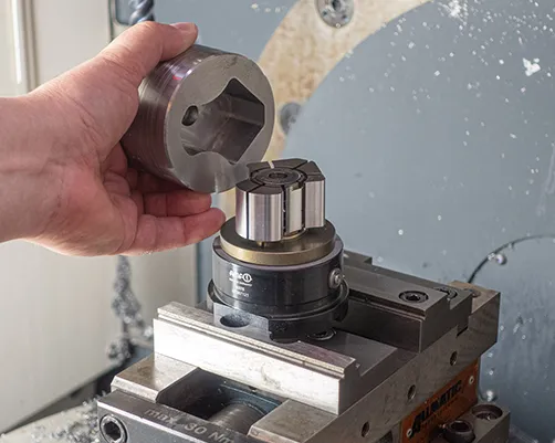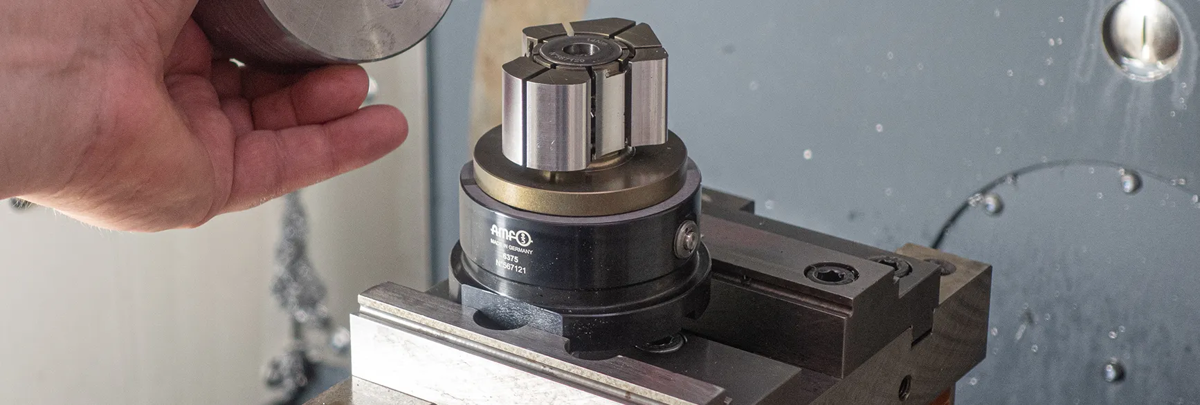 The modules are inserted into T-slots and on grid plates by means of screwed-in base elements. At the top of the vice, a spindle with a trapezoidal thread ensures that it is adapted to the workpiece.